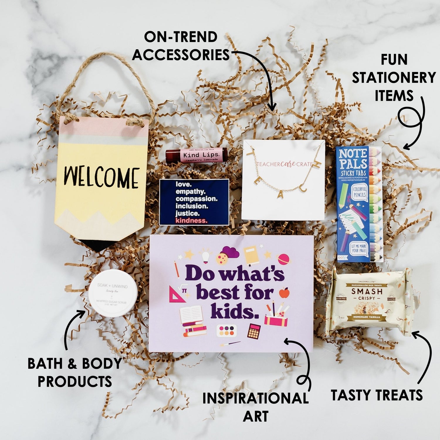 Every crate includes an on-trend accessory perfect for teachers, like a beaded lanyard, pencil earrings, or teacher tote bag.
